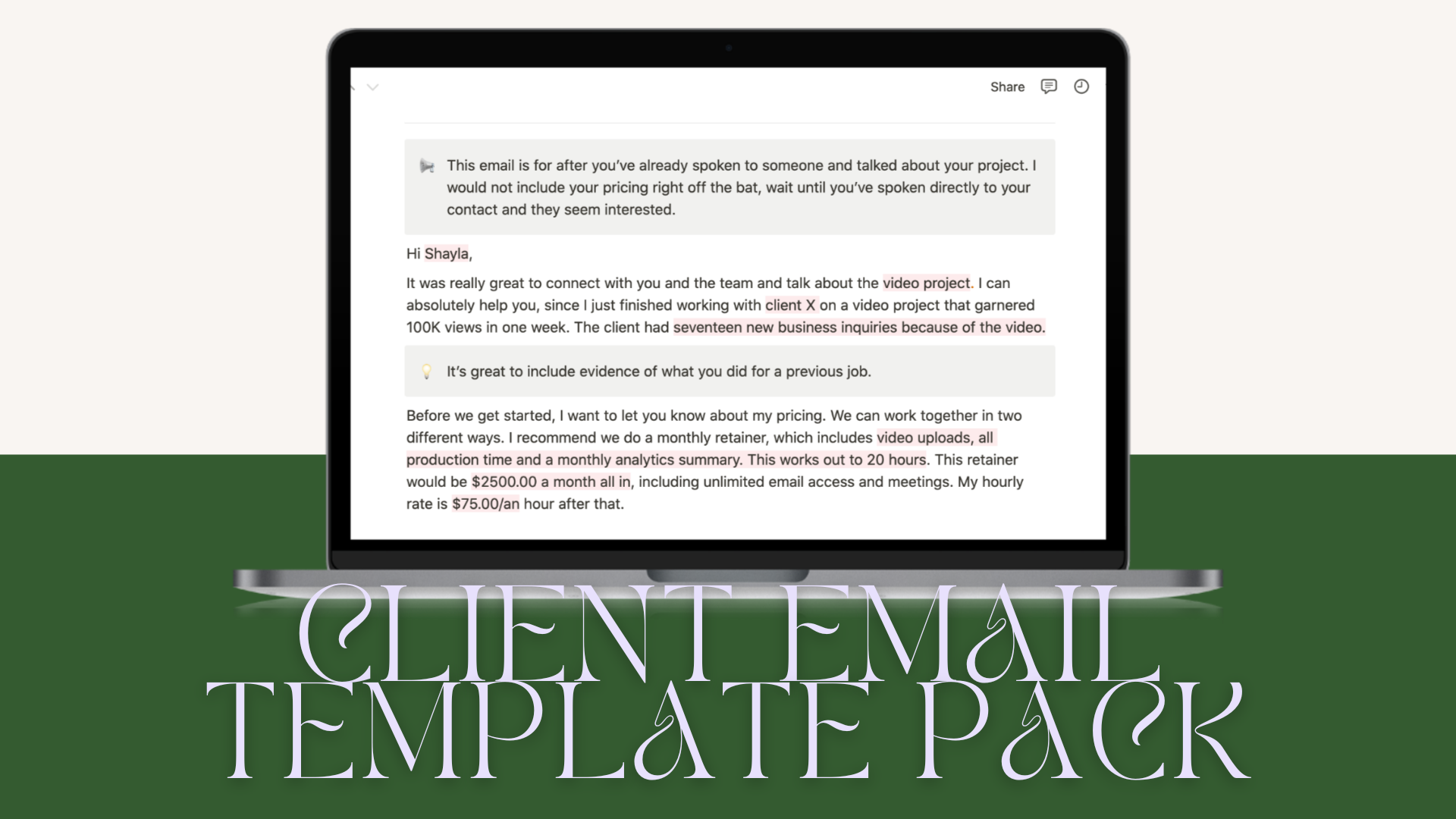 Customizable email templates built in Notion. Save time, communicate confidently with clients, make more money and cultivate more opportunities doing what you love 💃 .